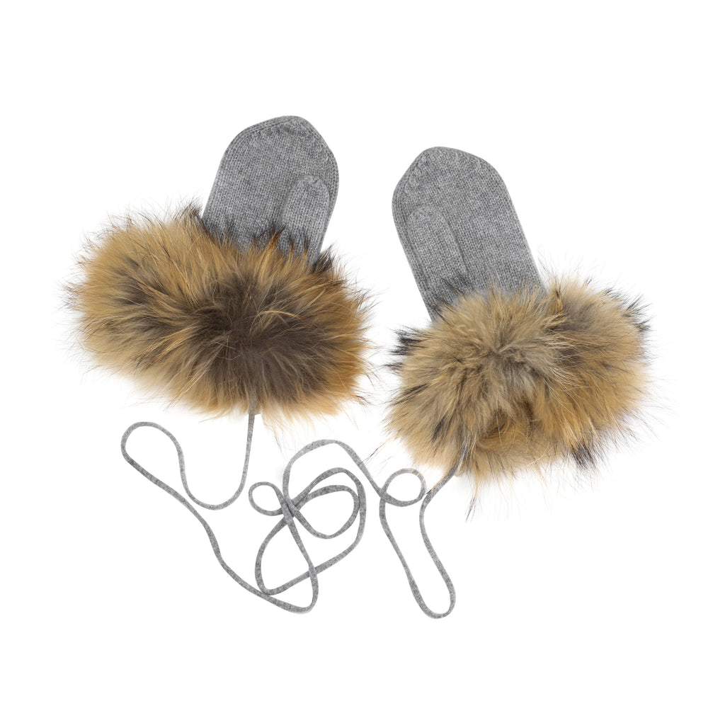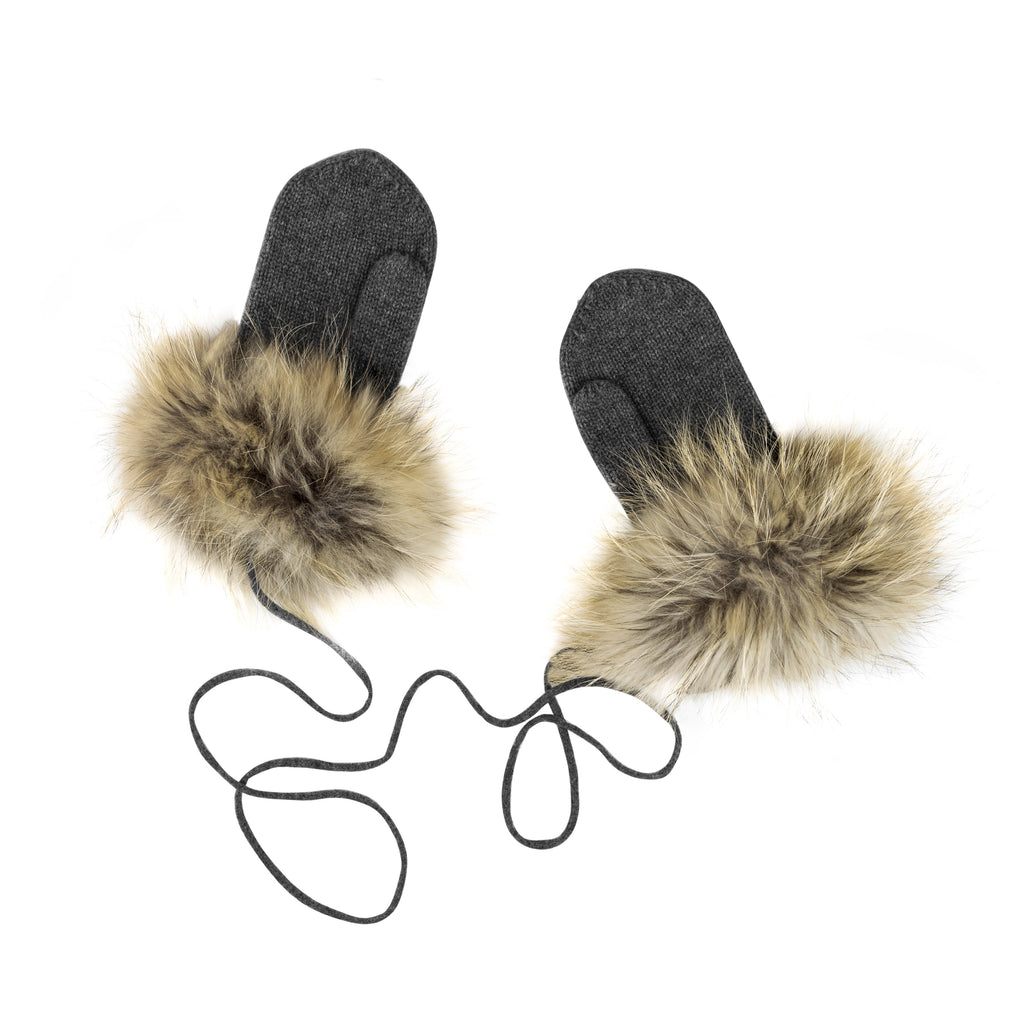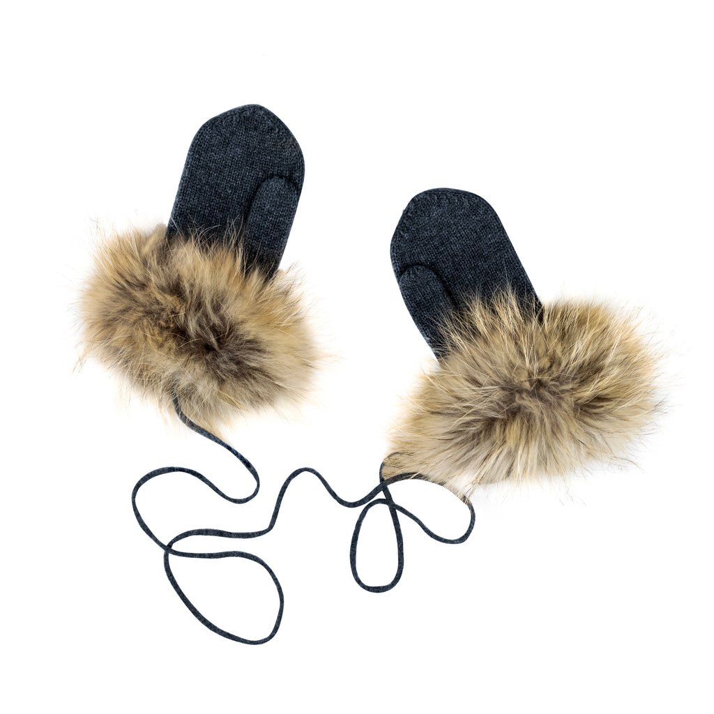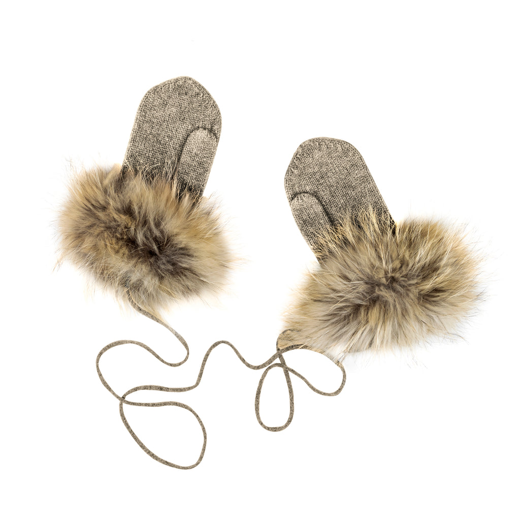 LCO's unique blend of cashmere and merino wool is trimmed with ethically sourced fur. A removable string is attached to the inside cuff of each mitten with a button.