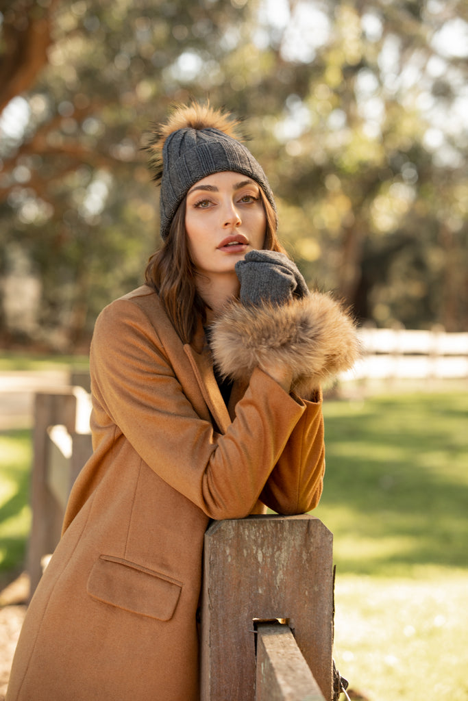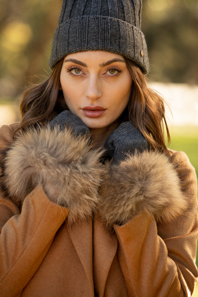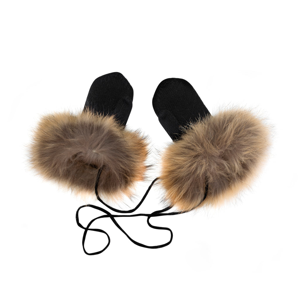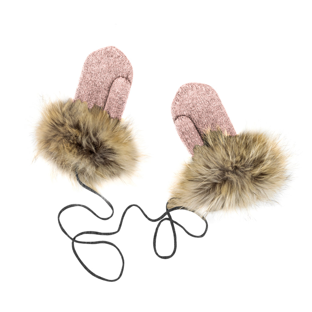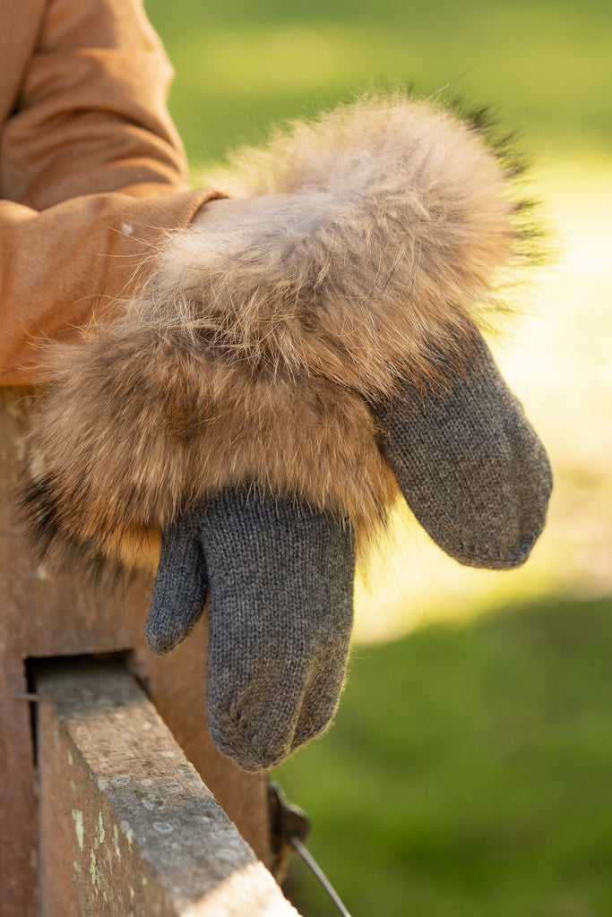 LCO's unique blend of cashmere and merino wool is trimmed with ethically sourced fur. A removable string is attached to the inside cuff of each mitten with a button.